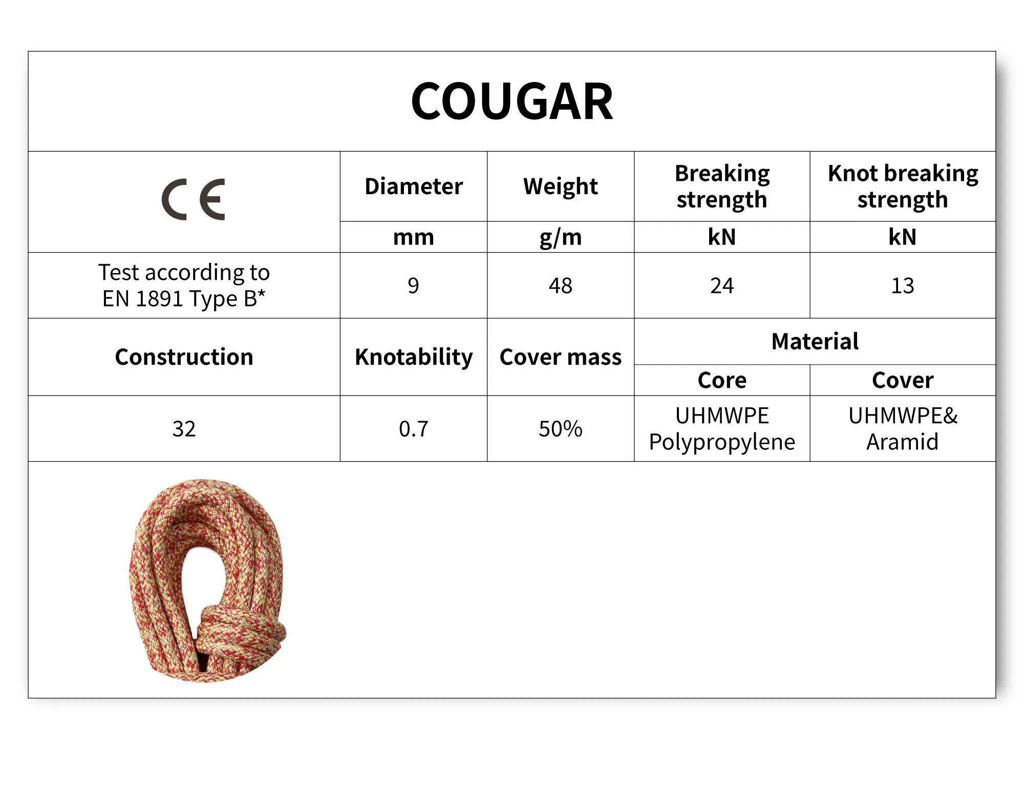 The Cougar is a highly durable and lightweight rope. Its abrasion-resistant sheath is a blend of UHMWPE and Aramid making it very heat- and cut-resistant. This makes the rope exeptionally strong and ensures longevity. The lightweight core makes it easy to carry and handle.