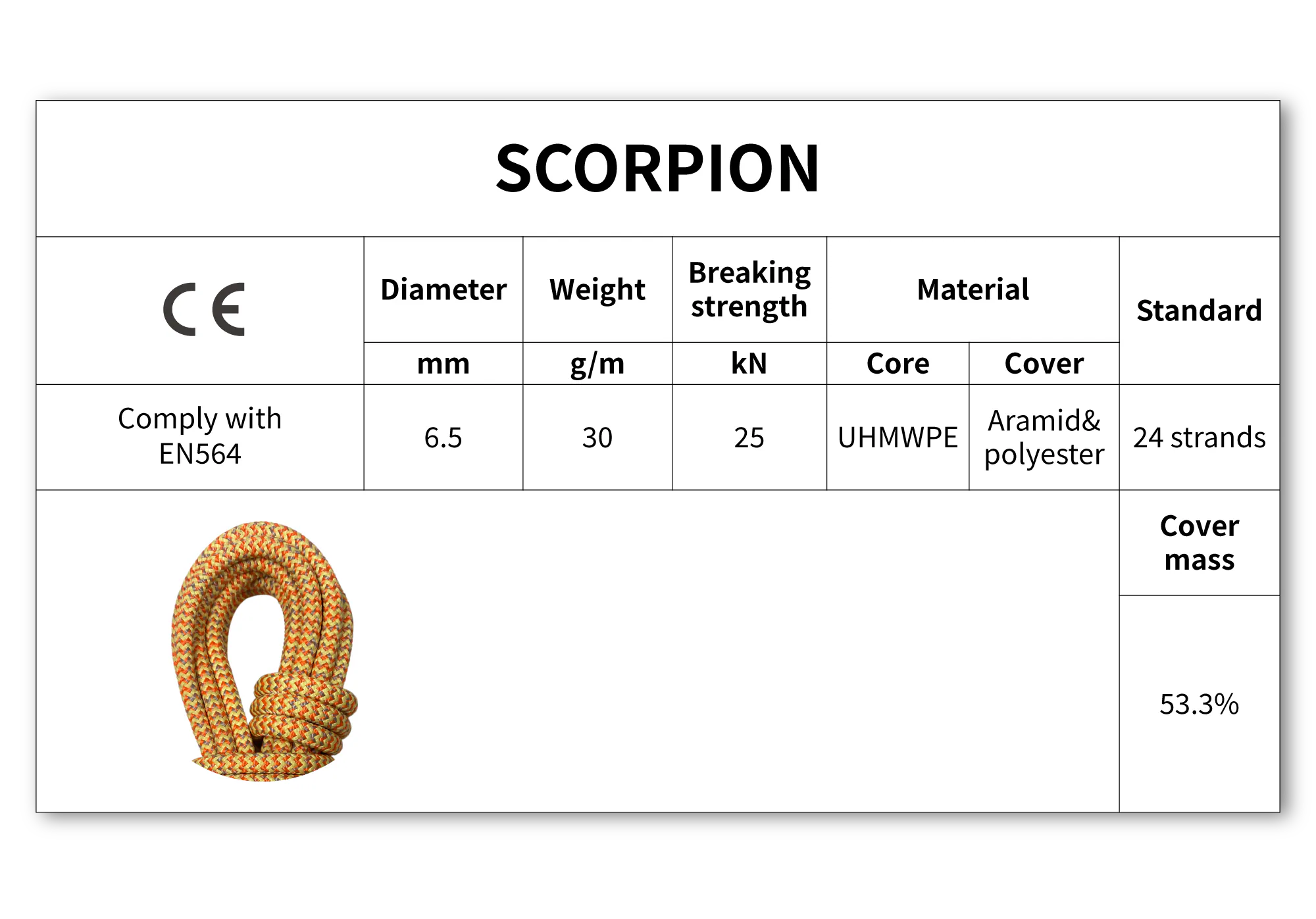 The Scorpion high-tenacity cord features a small diameter, lightweight design, and high strength, making it ideal for applications that require small-diameter, high-strength cord in specialized situations. The cover is made from a blend of aramid and polyester fibers, paired with a high-strength HMPE core, offering excellent heat resistance, cut resistance, low water absorption, and UV resistance. This makes it highly suitable for high-tension and high-exposure applications with repeated use. It can be used as cordelettes, tag lines, personal escape ropes, rappelling, or hauling systems.